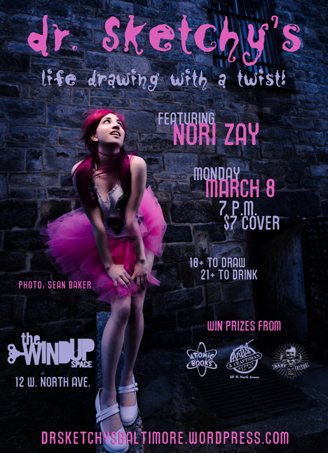 The fabulous alternative fashion and fetish model Nori Zay will be our muse at our next session on Monday, March 8—join us at the Windup Space for another night of drinks, drawing, and debauchery!