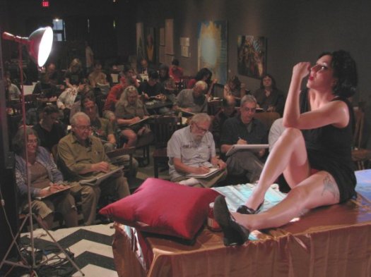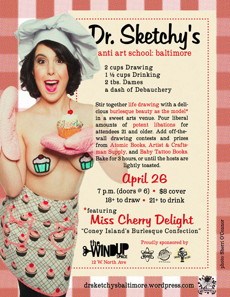 Tonight, April 26th, is a super-duper special session with Miss Cherry Delight, Coney Island’s burlesque confection, who is coming down to Charm City for your drawing pleasure . . . not only that, but there will be free cupcakes from Sweet Sin Bakery!