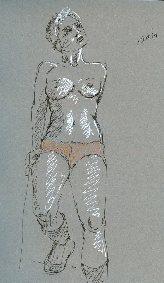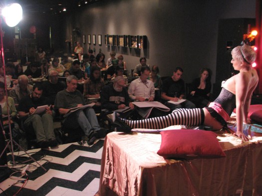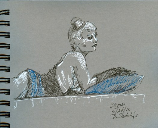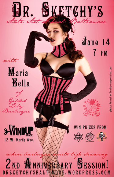 So, the opening reception for the Dr. Sketchy’s art show is tonight, June 9th, 7 to 9 pm at the Windup Space! Don’t miss it, come down, have some drinks with us where, for once, we won’t be running around like chickens with our heads cut off. 🙂 Then, our next session (and second anniversary session!) is June 14th with Maria Bella of Gilded Lily Burlesque, who will be fresh back from performing at the Americana Burlesque and Sideshow Festival in Asheville, NC—with us in tow, in fact . . . so if the car breaks down, y’all are screwed. —Aaron