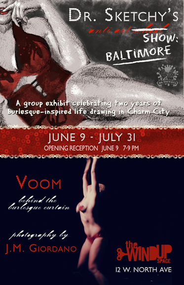 . . . not only that, but the winner got a frame from Artist & Craftsman Supply across the street on the corner of North Ave. and Howard, with the stipulation that they had to put a drawing in the frame, right on the spot, to be included in the Dr. Sketchy’s Baltimore Art Show. The opening reception for the show (and for Voom!, an exhibit of stunning burlesque portraits by photographer J.M. Giordano) is June 9th (that’s tonight), from 7 to 9 pm at the Windup Space.