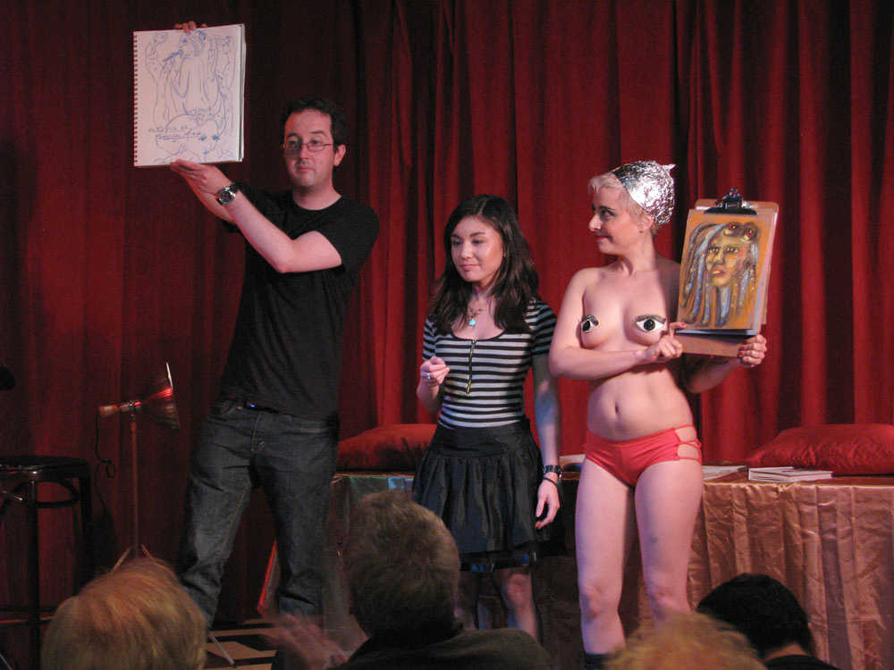 A trillion billion thanks to Little Luna of Gilded Lily Burlesque for not only making a hole in her schedule for your drawing pleasure once, but twice! (If you didn’t come see her, the rest of Gilded Lily Burlesque, and Mourna Handful perform on May 29th at the Windup Space, you seriously missed out on some serious sexy. Seriously.) Thanks as well to our generous sponsors, Atomic Books, Artist & Craftsman Supply (who also helped us frame a few additional drawings for the show), and Baby Tattoo Books; if it wasn’t for them, we’d have no prizes to give away. Also well-deserving of the thanking is Russell of the Windup for slinging drinks and songs, Bill for filming the documentary and bouncing creepy people out the front door, Jeff for taking all the great photos above (who, btw, has some work in the show as well), the artists who contributed work for this post, and Alexis for being your host. Conan should take her on the road with him.