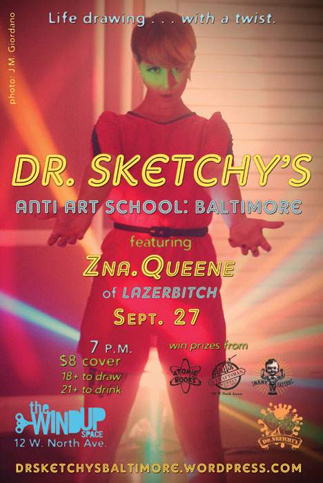 Next Dr. Sketchy’s Anti-Art School Baltimore is Monday, September 27, 2010 with Zna. Queene of LAZERBITCH!  (Special thanks to J. M. Giordano for letting us use the photo above – btw, if you want to check out more of his work, check out his fashion column in the Urbanite.  If look carefully, you’ll see Alexis in there at the latest Gilded Lily Burlesque show being all, um, fashionable:)
