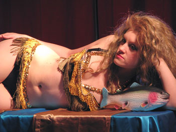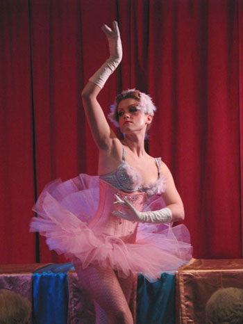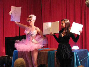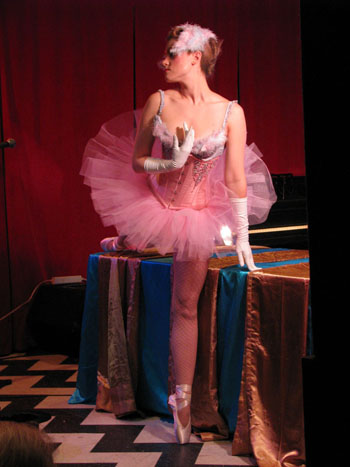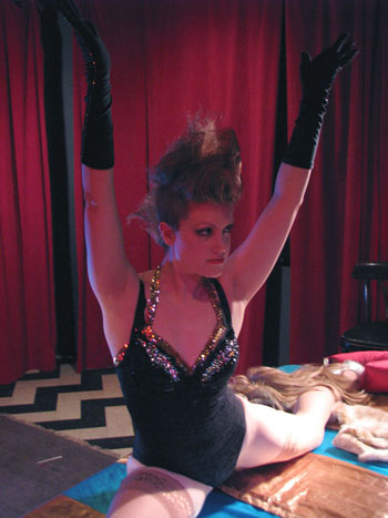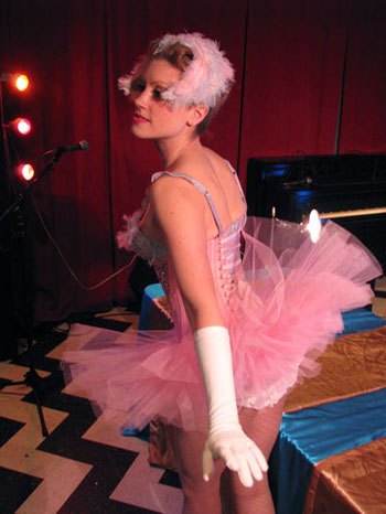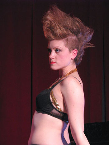 After a break so everyone could refuel on liquid courage, it was time for the first twenty-minute pose and our third contest of Buffy Summers, who, if she were real (she’s real damn it, don’t make me cry!), would have been celebrating her 30th birthday. (Yes, we’re talking about the Slayer. If you don’t know who she is, minimize this web page, go watch all seven seasons, and come back.)  The prize was a pair of bad-ass back-seamed stockings from our brand new sponsor, What Katie Did, whose unmentionables are what unmentionables were meant to be, versus the sad generic nonsense someone picked up from Target on your birthday.