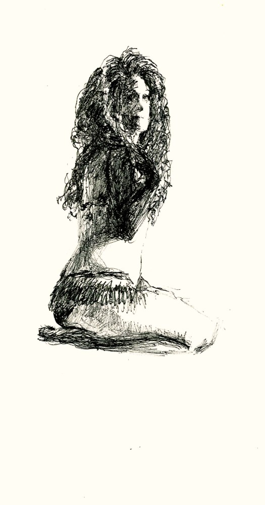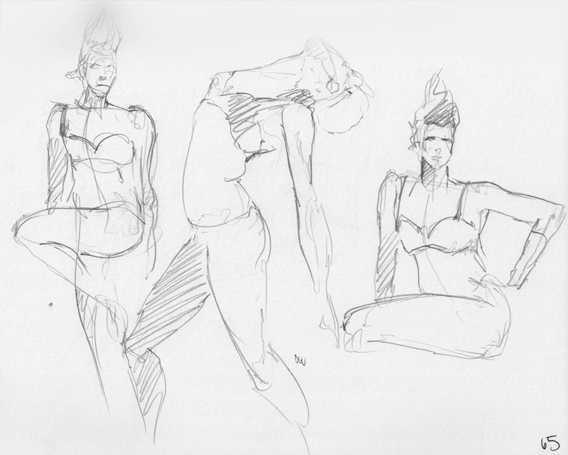 Look at that crowd! Lordy, lordy. After a quick break we moved on to the 5-minute poses, which started off with the dreaded opposite hand contest where, if you’re right-handed, you draw with your left, and if you’re left-handed, you draw with you’re right, and if you’re ambidextrous, you draw with your center hand.  As always, all contests are optional—if you see a good pose and say, “Nooo!  I want to draw this one normal!” for God’s sake, draw it normal.  Art comes first.