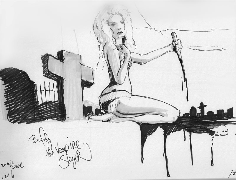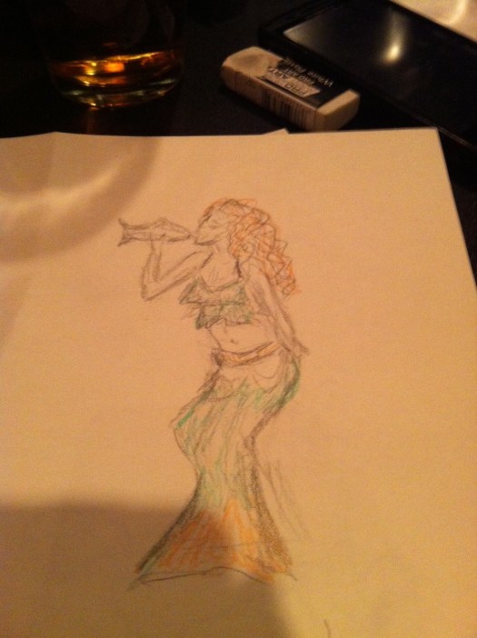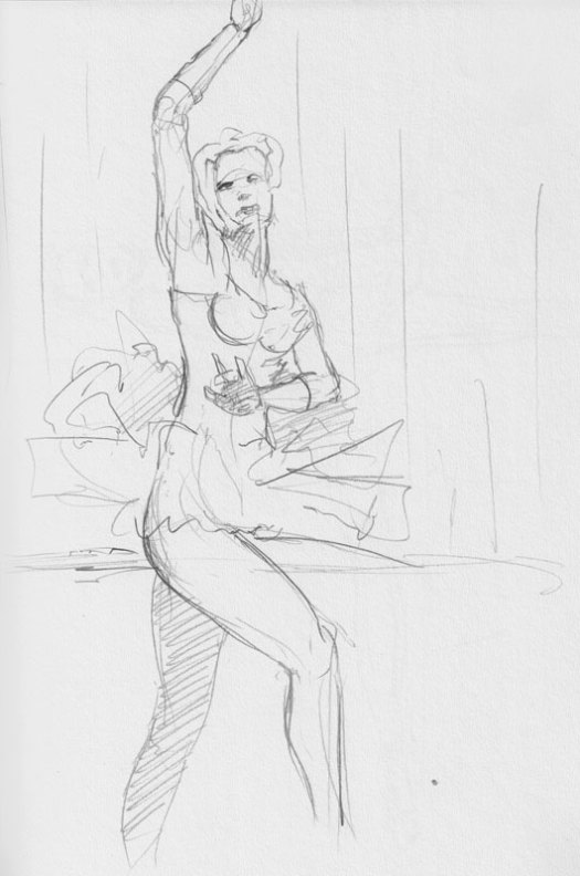 While everyone was drawing, we played “Walk through the Fire” from the Buffy musical—and I must say, watching the crowd recognize it, and then start to sing along, might end up being my favorite Dr. Sketchy’s moment of all time.