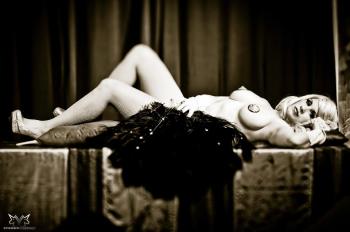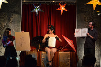 Another break, yadda yadda yadda, and it was 20-minute pose time.  Our third contest of the evening was the best incorporation of “69” since it also happened to be our 69th session.  The winner received Visions From Within the Mechanism: The Industrial Surrealism of Jeffery Scott from Baby Tattoo Books.