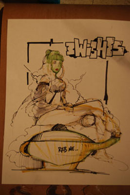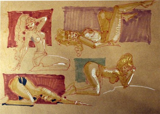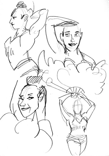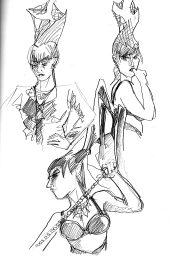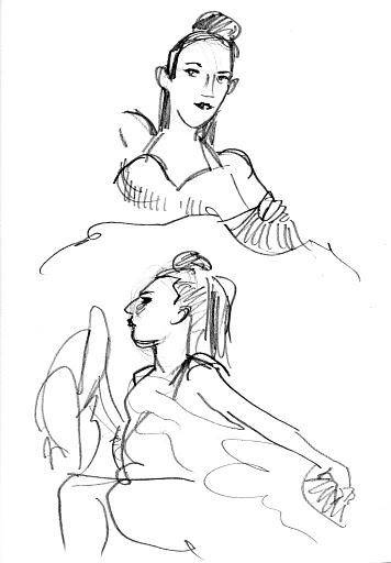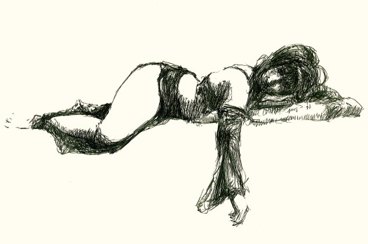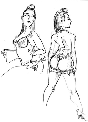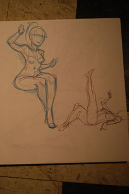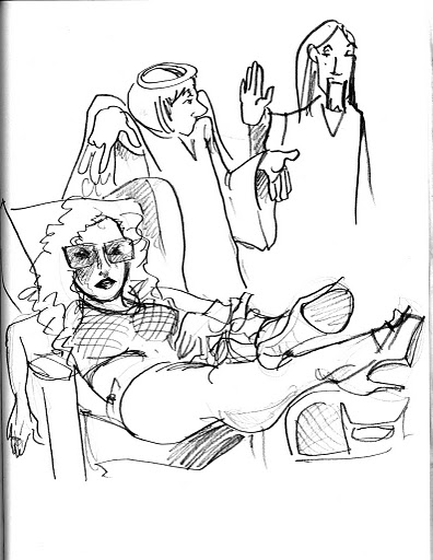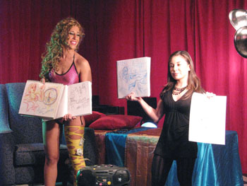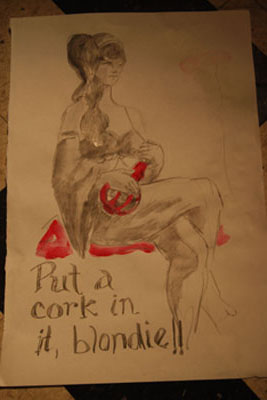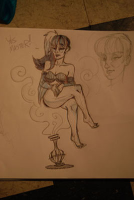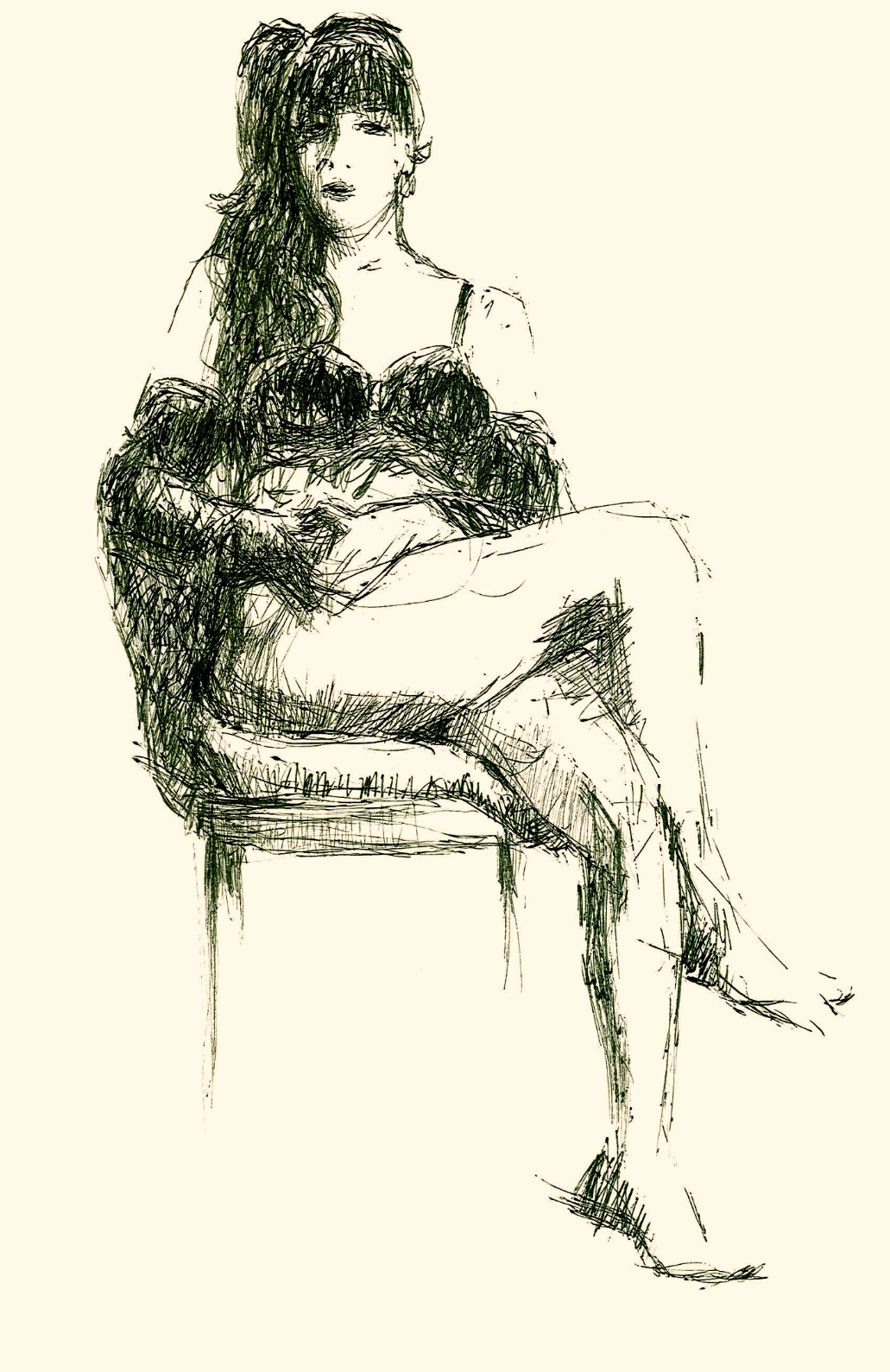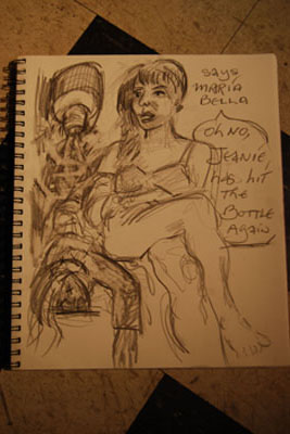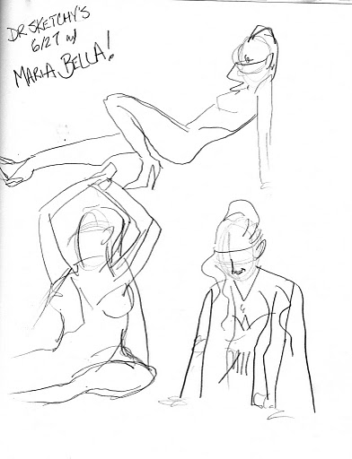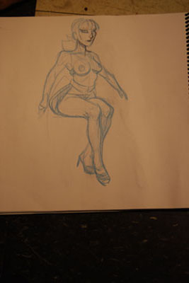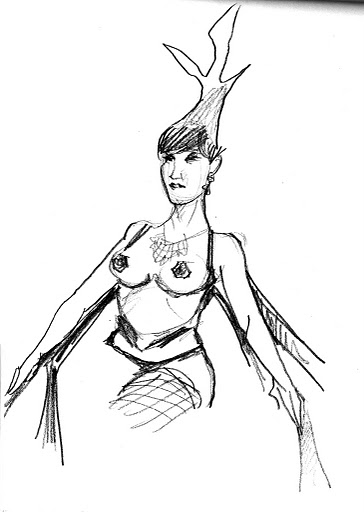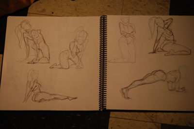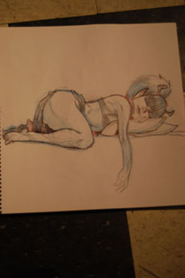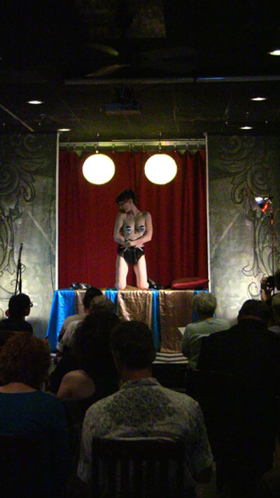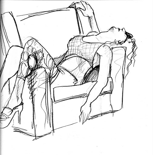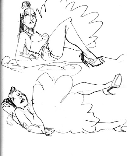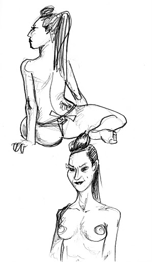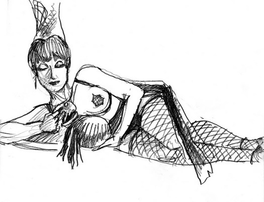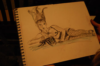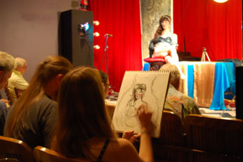 We took a break so folks could get a drink, smoke, whatever (I don’t pay attention, as far as I know they were fighting with bottles out back), and then it was time for the 5-minute poses, the first of which is the opposite hand contest where, if you’re right-handed you draw with your left hand, and if you’re left-handed you draw with your right, and if you’re ambidextrous you get heckled by Alexis on stage, you freak.