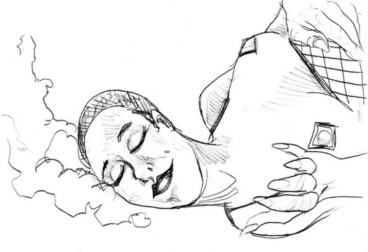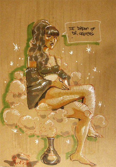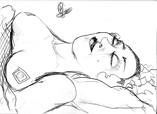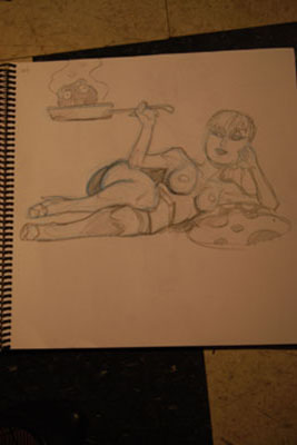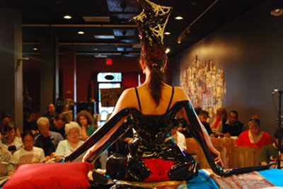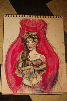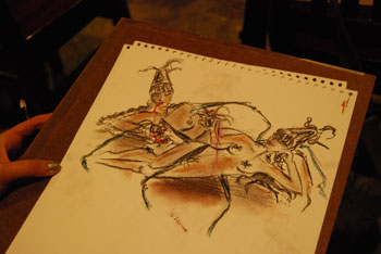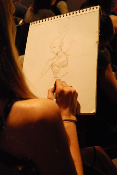 Next up were the 10-minute poses, the first of which was, to go with Maria’s fabulous black widow costume (made by Marla Meringue!), the best incorporation of Maria eating her lover’s head. The winners received sketchbooks and calligraphy pens from Artist & Craftsman Supply which is just down the street on North & Howard. (By the way, this was the last session A&C was going to sponsor—they’re a great shop and we wish them well. 🙂 )