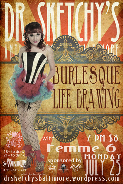 That’s right folks, between some birthday/traveling shenanigans and the Windup being closed for a week in August, there will be no sessions until September! Ā Dum dum duuuuuummmmmmm. Ā Next session, Monday, July 25th with Femme 6 is your last chance to attend a Dr. Sketchy’s before the, umm, cold winds of September blast through Baltimore!