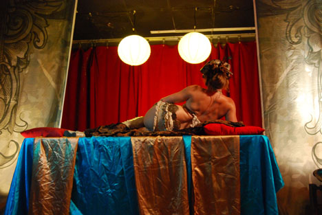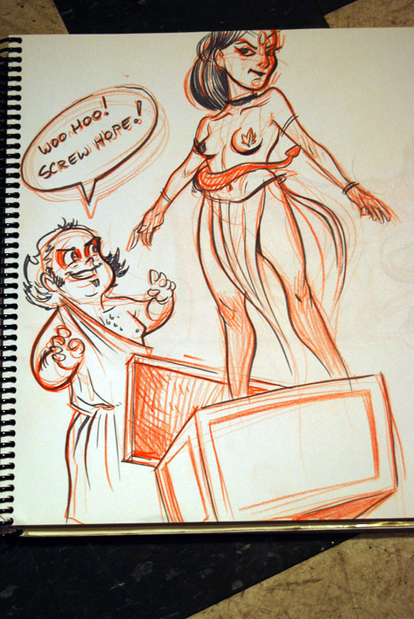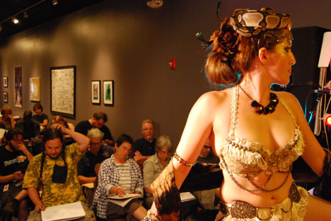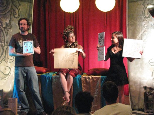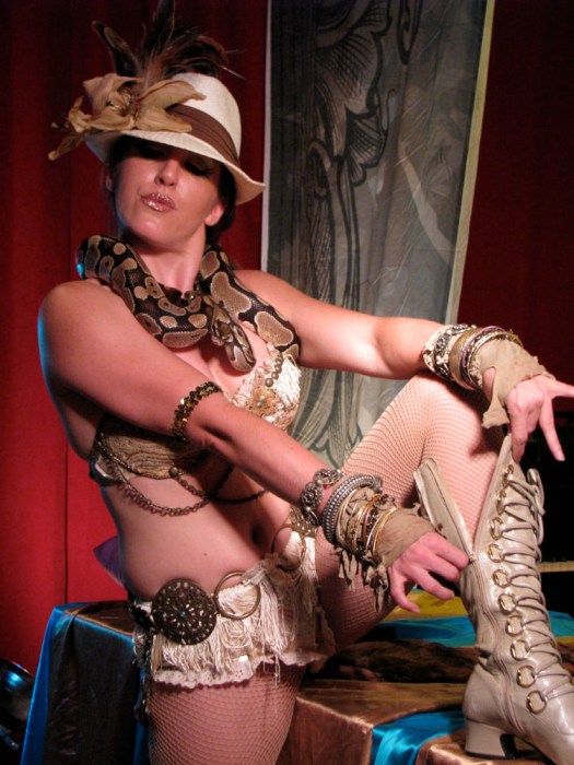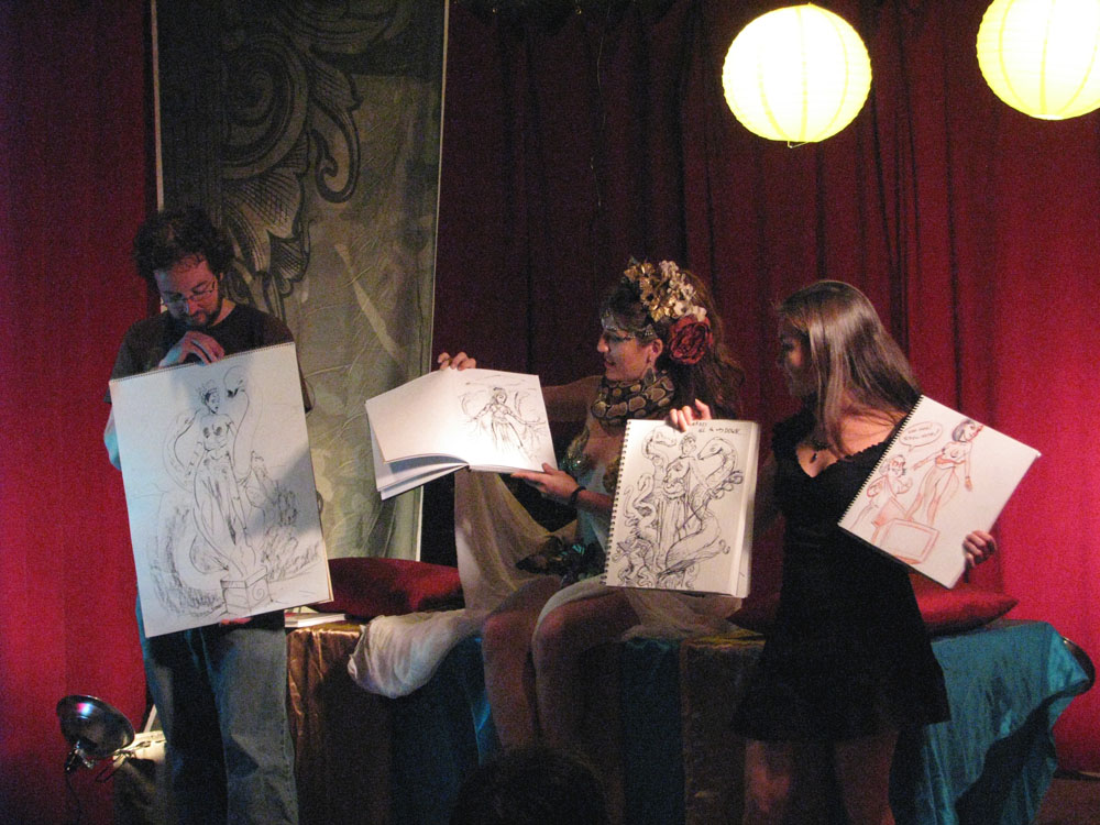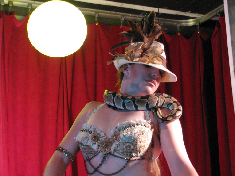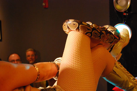 Many, many, many, many thanks to snake-charming, belly-dancing Rio; many thanks toĀ Rabbi Loew for not bursting through support beams and chewing up any high school principals; thanks to our sponsors Atomic Books, Flying Dog Brewery, and Baby Tattoo books; tons of thanks to Jeff and Alexis for the death-defying nature photography you see above; thanks to Russell for slinging booze and songs; thanks to our brand new Dr. Sketchy’s person Stiger for helping me and my busted-up hand with the set-up before and after and with the timer; thanks to Fred, Kerry, and, err, several other people who helped shove some of the furniture back in place at the end; and last but not least thanks to Alexis for being our host even though she has a phobia of snakes.