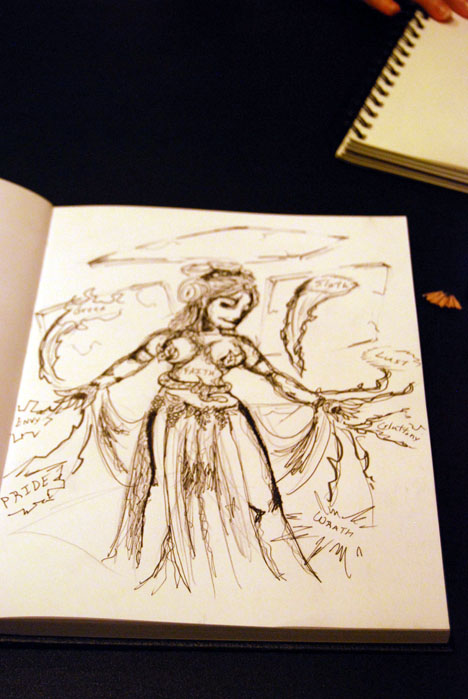Meanwhile, as we all sketched merrily away, a storm was a brewin’. Ā Literally. Ā Russell and I stepped outside to discover the NothingĀ was bearing down the Windup Space like an out-of-control Michael Bay explosion. Ā Oh, and when it hit, it hit. Ā Smokers scattered in gibbering terror, thunder drowned out the music, and Russell plunged head-long into a play list of nothing but “Blame it on the Rain”, “Purple Rain”, and the like. Ā If I could have lashed a steering wheel and myself to the door stand and screamed challenging obscenities at Mother Nature, I would have.