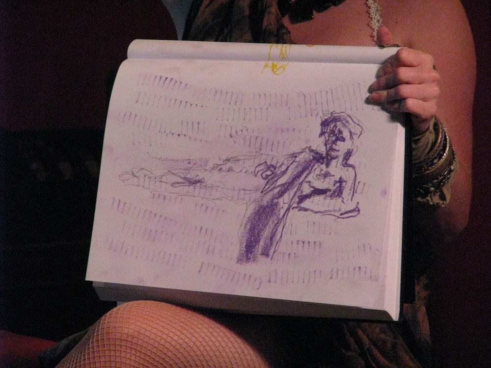 So, since we’re been taking our sweet time to put up the recap of Femme 6’s session with us, consider this the last call for sketches of our lovely model from that session, folks. Scan (or shoot with your camera phone) your drawings and send them to us at drsketchysbaltimore(at)gmail.com, or post them on our Facebook page’s wall. If you haven’t liked our page yet, do yourself a favor and go do that now: we update that page more often than the blog, so if you’d liked us already, you would have gotten a reminder about Poetry in Pasties before now, and you would have seen photos from our last session. (You could have also seen photos earlier if you followed us on Twitter.) But, since you’re reading this blog and we like you, here’s a photo from that night.