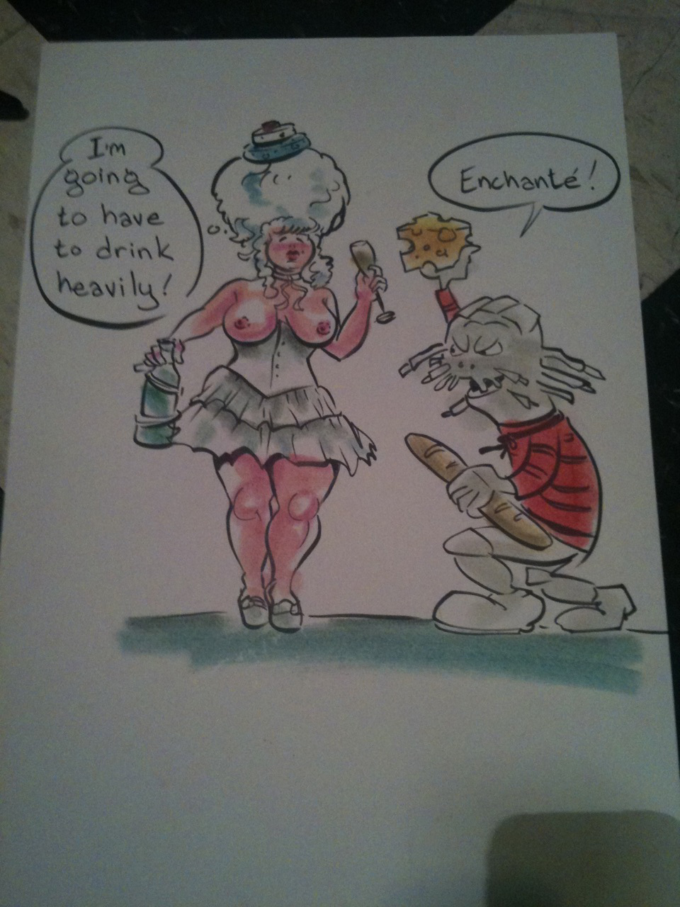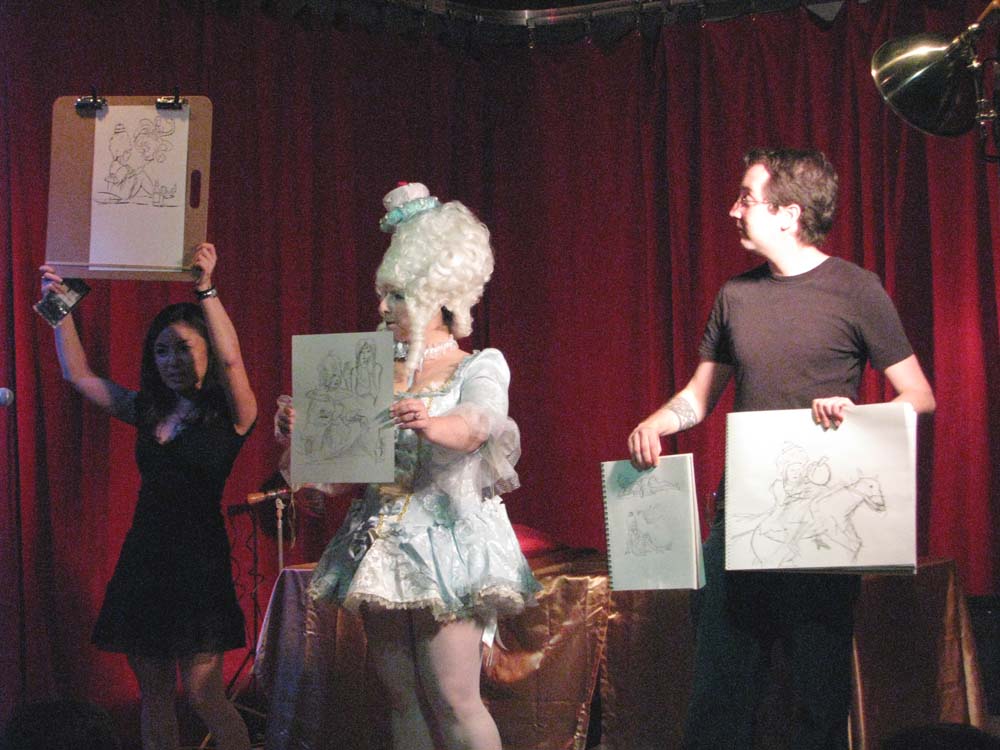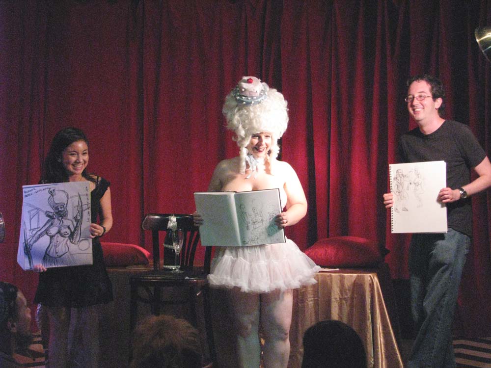 A quick break for folks to empty their bladders and fill their glasses (pints of Flying Dog Beer for 3 bucks!) and then Dahlia took the stage again, this time as a cowgirl, for the 5-minute poses. As always, the first of these was the infamous opposite hand contest, where if you’re right handed you draw with your left, if you’re left handed you have to draw with your right, and if you’re ambidextrous, you have to do it with a beer balanced on your head. The two winners got a mystery shot from Russell at the bar.