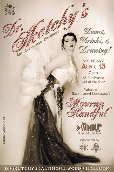 This was the first Dr. Sketchy’s during Artscape we’ve ever done—and though we were fully prepared to spend the afternoon drinking at the Windup bar with Valeria, a few crickets, and one heat-exhausted tourist in a motorized wheelchair, that apparently wasn’t in the cards. We didn’t know if it’d be a ghost town or if it’d be slammed. Not only was it successful (honestly, who doesn’t want to draw Valeria?), but we got to see all sorts of folks we haven’t seen at Dr. Sketchy’s Baltimore in a long time because of conflicting Monday night class schedules, Charm City Roller Girl practices, and underwater basket-weaving tournaments.