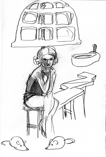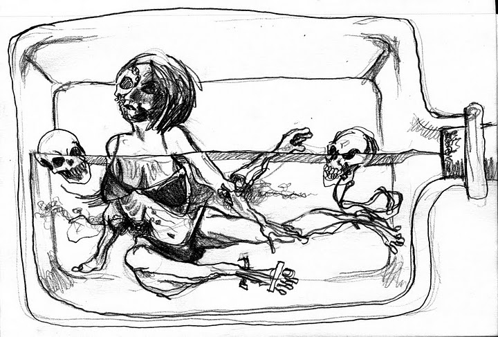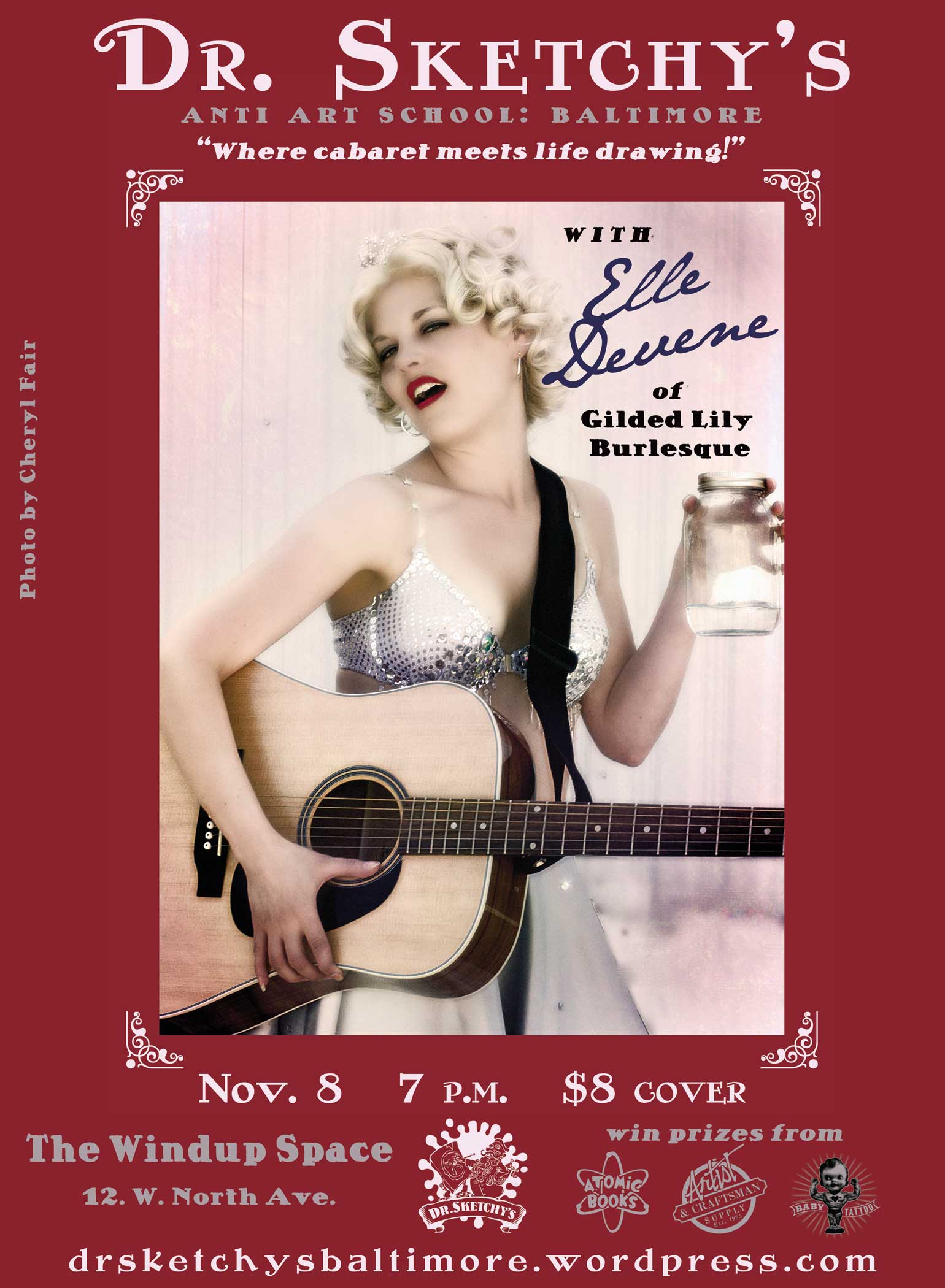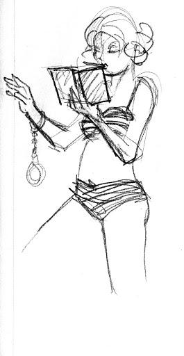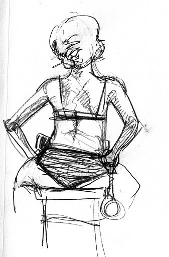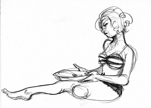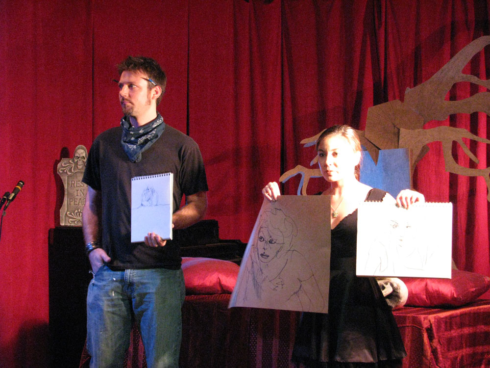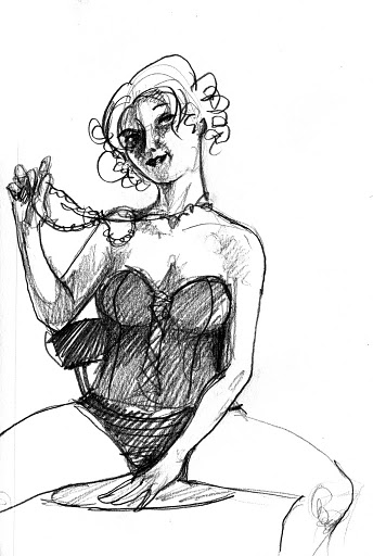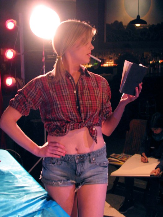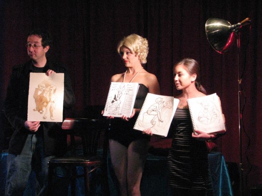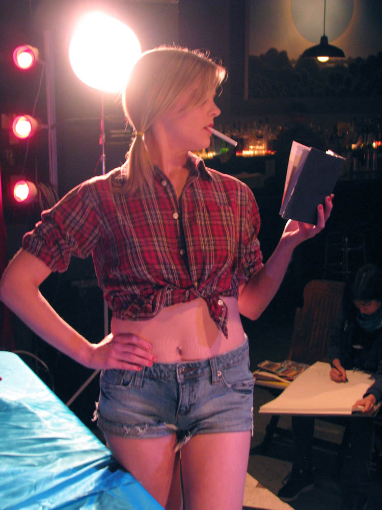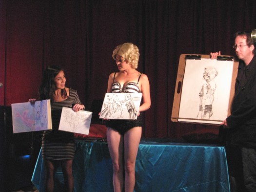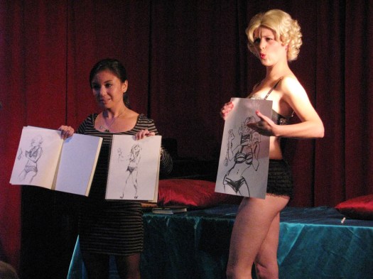 We’d like to thank Elle Devene of Gilded Lily Burlesque for a rocking good evening (and not to mention playing wheel-man for a surprising pleasant 12 hour road trip, most of which was spent either listening to John Waters recordings or cursing out the traffic), to Russell for the use of his wonderful bar AND slinging drinks AND slinging songs, to Jeff for the beautiful photos you just perused, to Alexis for valiantly manning the bridge, and last of all to all the talented folks who emailed us the drawings above or just plain came down last session to sketch Elle.