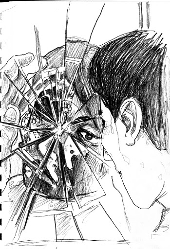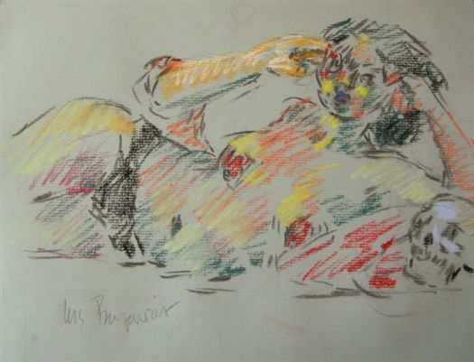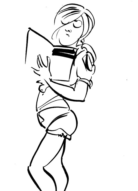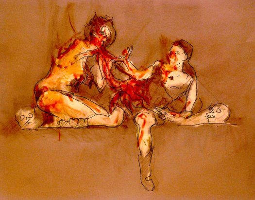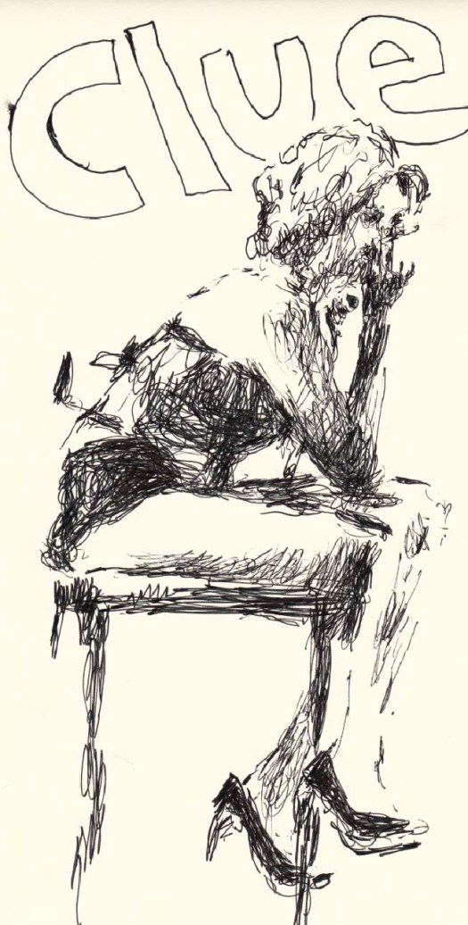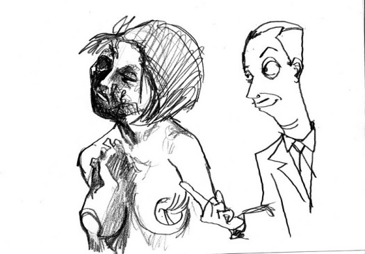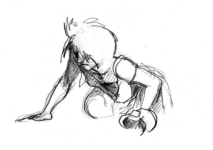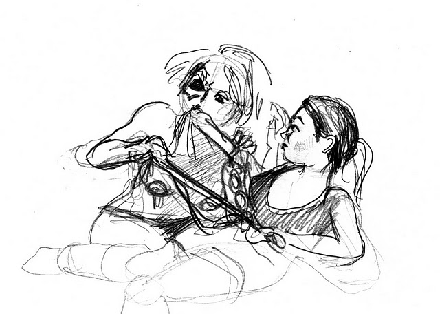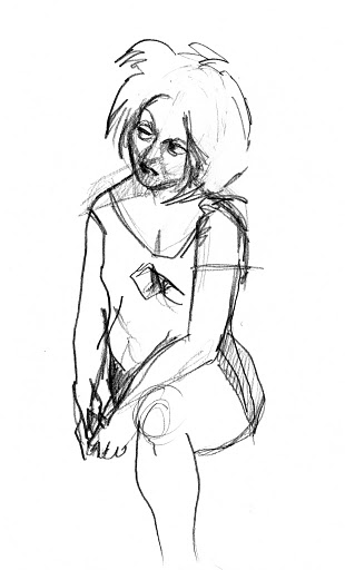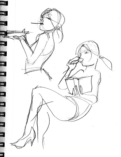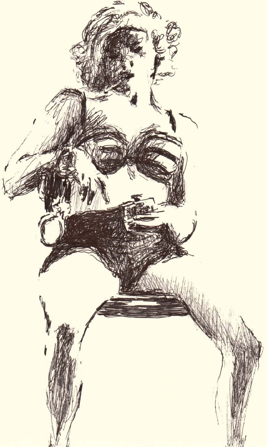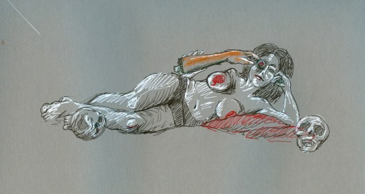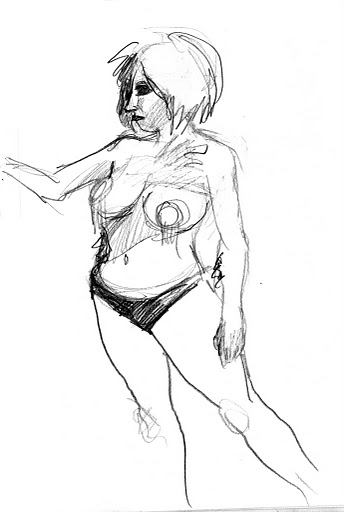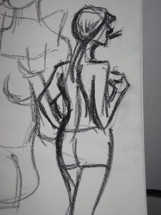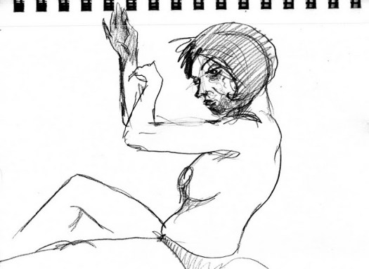 After a five minute beer/cigarette/tinkle break, we plowed ahead into the 5-minute poses, the first of which was the old stand-by opposite hand contest, where [deep breath] if you’re right-handed you draw with your left, if you’re left-handed you draw with your right, and if you’re ambidextrous you lay down your pencil and rely on Jesus or something. Of course, all contests are optional, but if you chose to partake, the two winners secured a mystery shot from Russell at the bar.