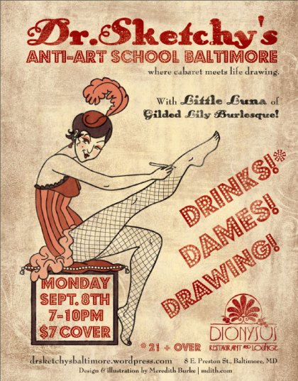 Monday, Sept 22, from 7 to 10 is the next Dr. Sketchy’s…Maria Bella of Gilded Lily Burlesque is going to be our fabulous model, so make sure to remember your contacts. Jay Calvert took the photo above btw, and Alexis did the flyer design.