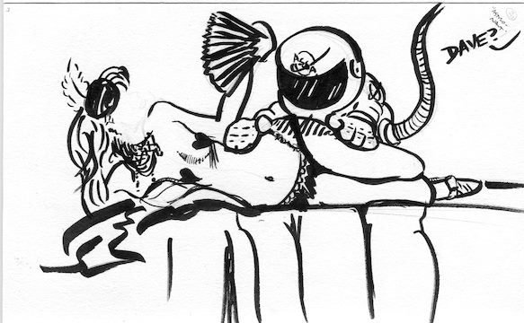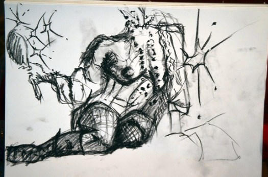 The second ten-minute pose was the random noun contest, in which your hosts forget to think of a contest and so turn to the audience for help, in the form of suggestions of whatever person, place, or thing comes to the minds of the artists. “Armadillo” won out, so everyone was asked to incorporate this creature into their drawings. The prize? It was either a mini-Munny, or a copy of Sparrow, vol. 4: Shane Glines—time and alcohol have made our memories hazy. Either way, these prizes were donated by the always awesome and generous Atomic Books of Hampden.