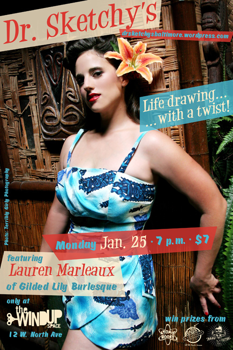 Our next Dr. Sketchy’s is Monday, January 25th at 7 pm, doors at 6, with Lauren Marleaux of Gilded Lily Burlesque. Alexis is finishing up the flyer as I type, so we should have that tomorrow.