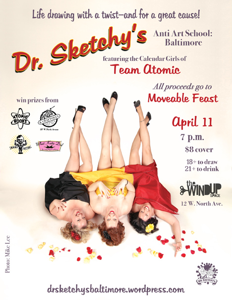 Next Dr. Sketchy’s is Monday, April 11, with Team Atomic to benefit Moveable Feast!  All cover and tips go to charity!  You get to do a good deed AND draw AND have a beer.  Life doesn’t get much better than that.