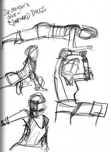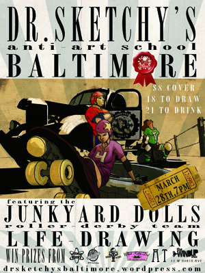 Well, according to comments made during and after our session with the Junkyard Dolls roller derby team, it was the best session we’ve ever done.  I’m not saying it WAS, mind you—all I need is every past Dr. Sketchy’s Baltimore model showing up at our apartment with a brickbat—I’m just saying SOME people are SAYING that. Everybody has their favorite sessions, whether it’s the zombie session, Tony Apollo’s, that session where we just had a very angry hedgehog taped to a barstool for three hours—let’s face it, there’ve been some really great moments.