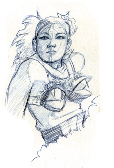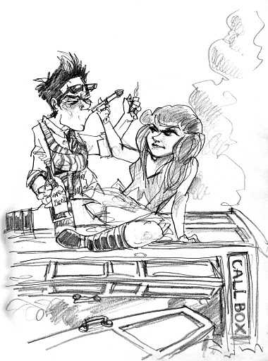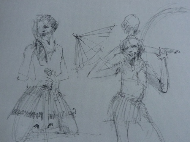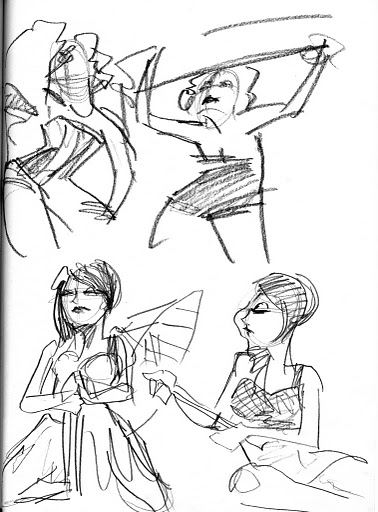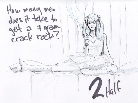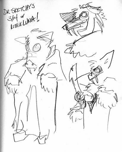 A quick break and it was the first 20-minute pose of the evening with the contest being Random Noun, where folks in the audience shout out something until we all hear something amusing.  It was ALMOST “Doctor Who”, but a last-minute shout of Charlie Sheen won out, though a sonic screwdriver managed to sneak into Little Luna’s hand anyway. To appease the geeks who were, for once, outnumbered that night, we gave extra points for drawings incorporating both.