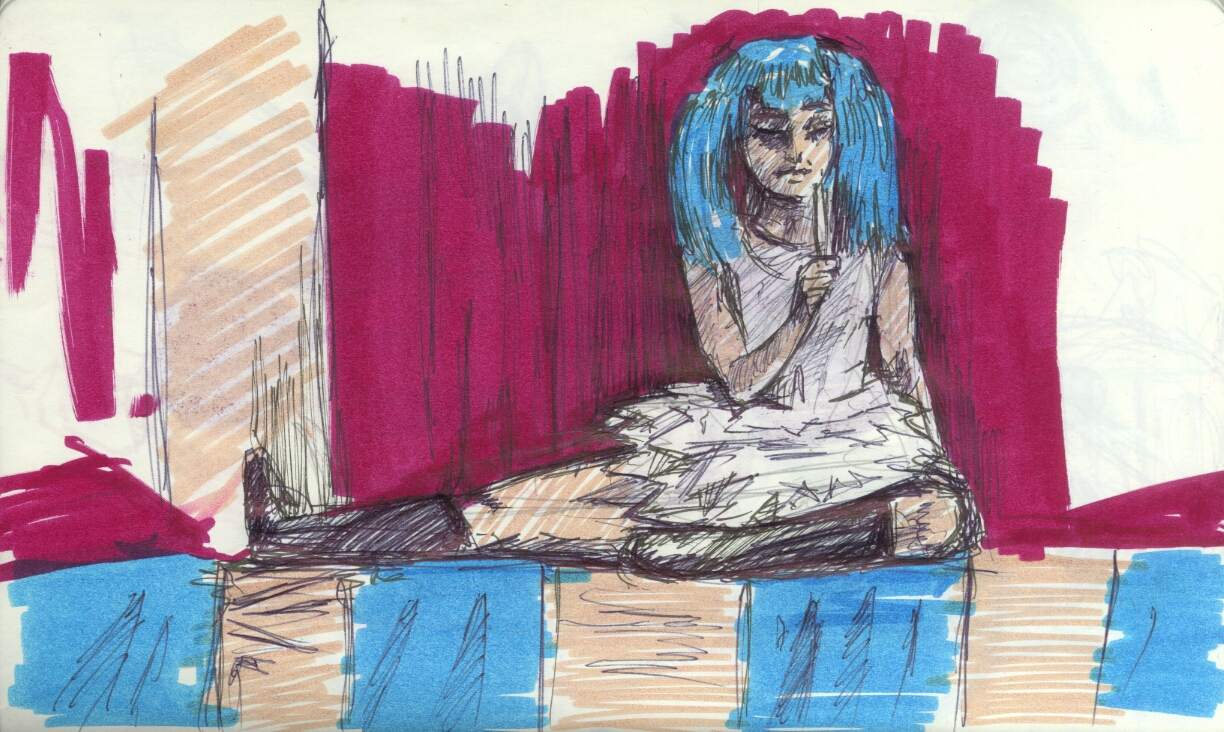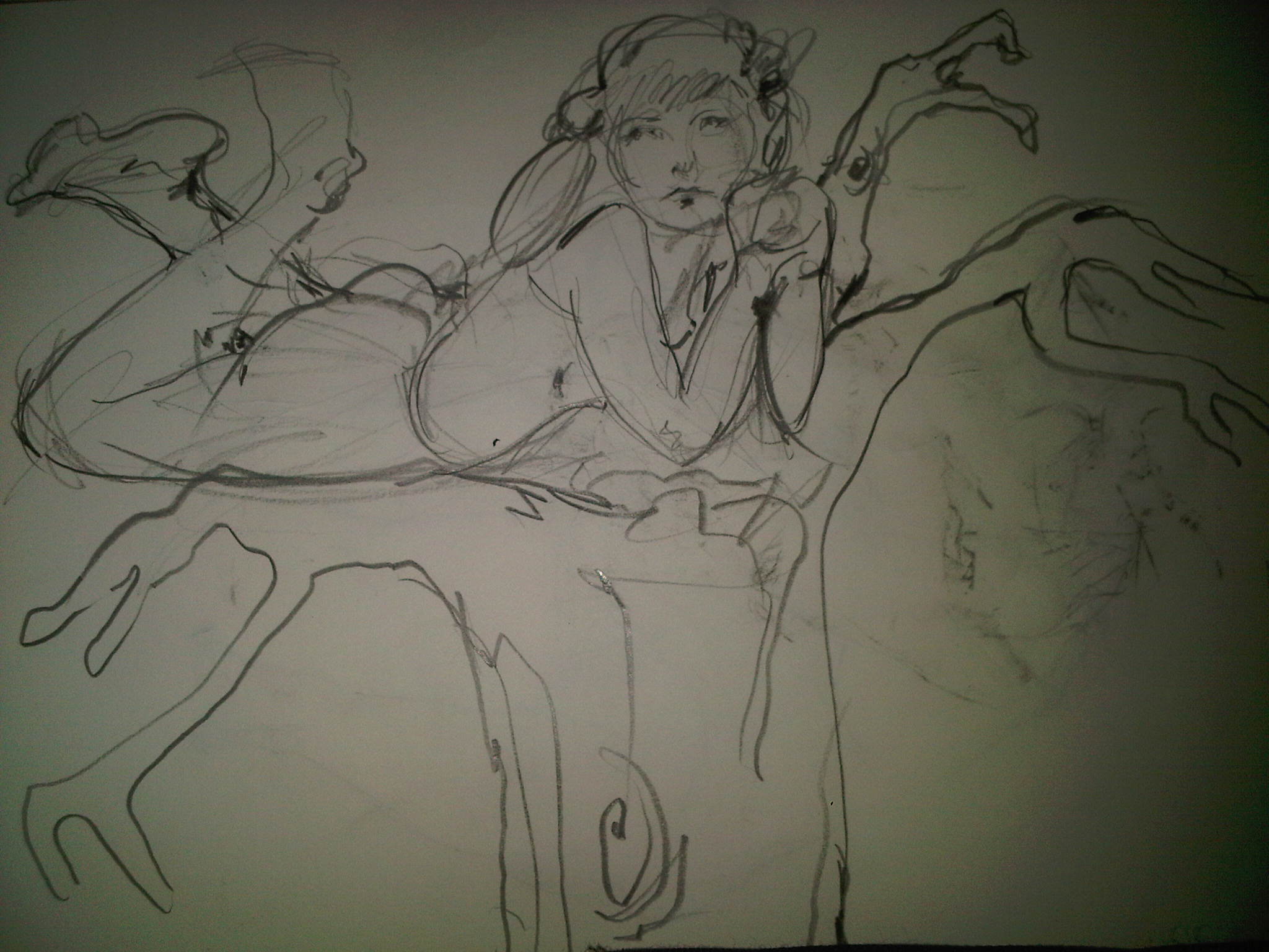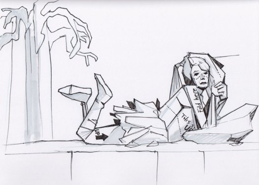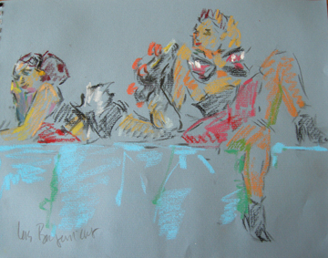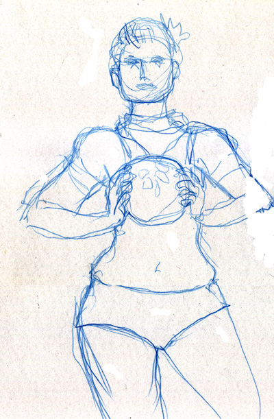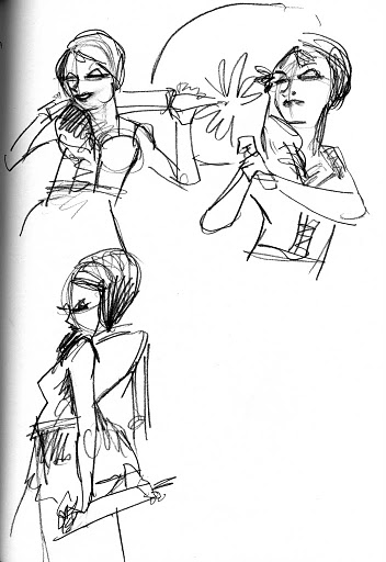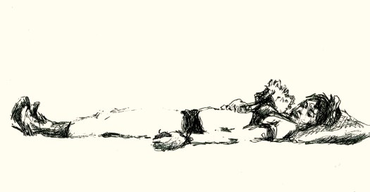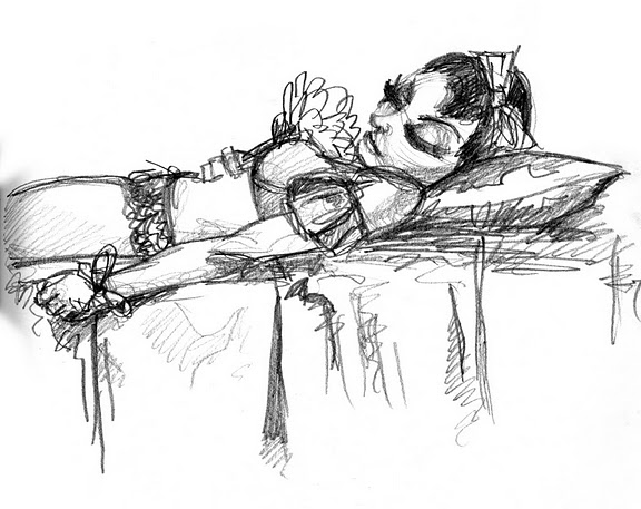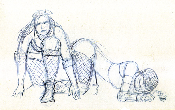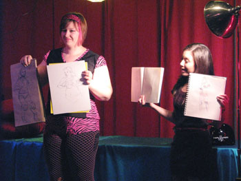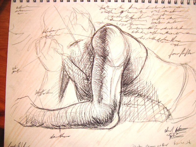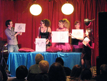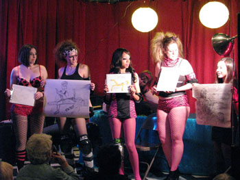 We took a short break so everyone could restock on liquid courage and dived straight into the five-minute poses, the first of which was the opposite hand contest where if you draw normally with your right hand, you draw with your left, and if you normally draw with your left, you draw with your right, and if you’re ambidextrous–OH MY GOD WRITING THIS SENTENCE TWICE A MONTH FOR 3 YEARS STRAIGHT IS DRIVING ME TO A PSYCHOTIC BREAK.  THIS IS THE SHIT THAT LEADS TO HEDGEHOGS TAPED TO BARSTOOLS, FOLKS.