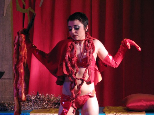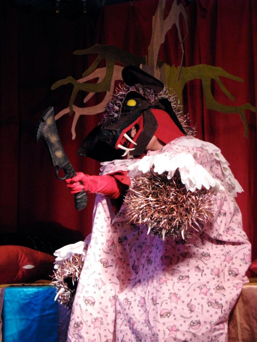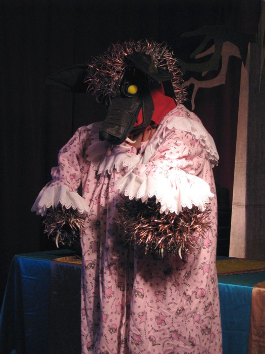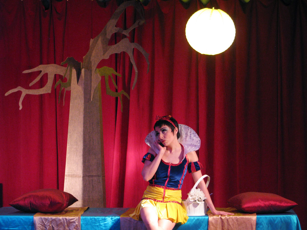 Oh, sit back, pour yourself something bitter, and let me tell you the story of me and this damn tree.  (If you have any sense, you’ll skip this nonsense and scroll down.)  For a while now I’ve been trying to figure out ways to decorate the stage in more and more elaborate ways.  Though ostensibly an easy task, it’s made a lot more trying by the fact that neither Alexis nor I own a car.  Why do we not own a car, you ask?  Cause we’re dirty hippies.