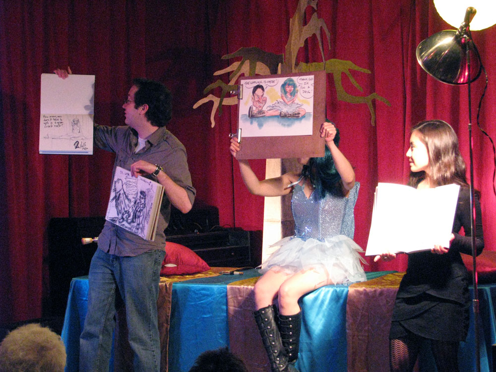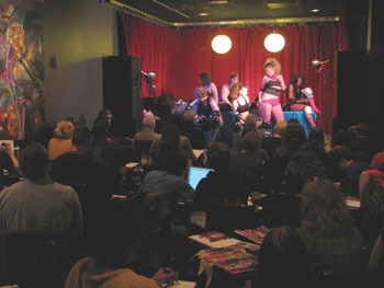 I’d like to thank the Junkyard Dolls roller-derby team for one of the best sessions we’ve ever had; our generous sponsors Atomic Books, Artist & Craftsman Supply, Baby Tattoo Books, and What Katie Did; Russell of the Windup Space for the fantastic venue and for slinging booze and music; Jeff for rocking the photos; and Alexis for MC-ing the whole shebang.