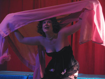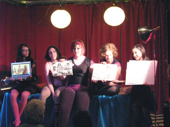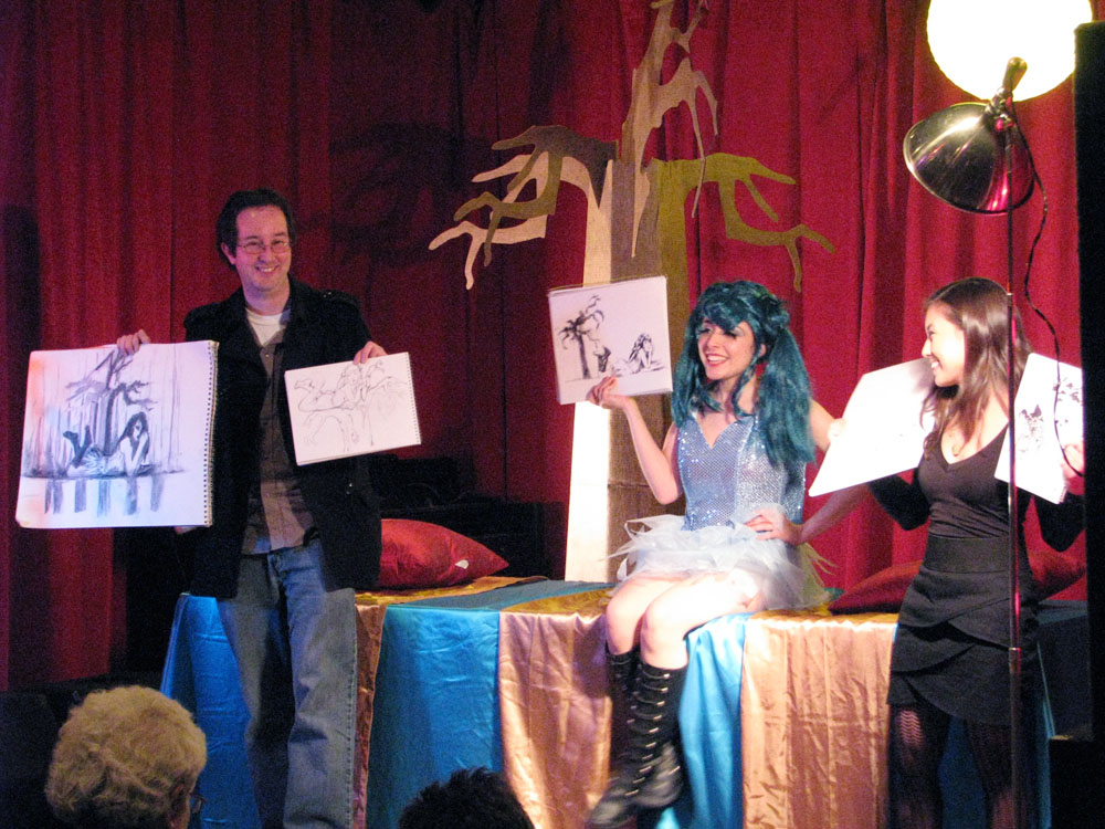 Many thanks to Little Luna of Gilded Lily Burlesque for doing a smashing job;  thanks as well to our sponsors Atomic Books (especially to Ben for dropping off the prize at the last minute when we ended up not being able to go pick it up), Artist & Craftsman Supply, Baby Tattoo Books, and What Katie Did; lots of thanks to Gilded Lily Burlesque for donating to free tickets to their show to give away;  thanks also to Russell of the Windup Space for slinging drinks and songs, Jeff for the ninja-camera-work, Alexis for manning the microphone, and last but not least, to Viola Van Wilde, Brian K., and Scott for multiple trips to get that damn tree.