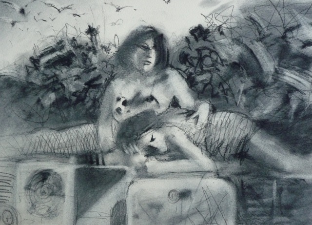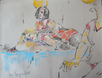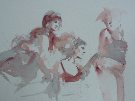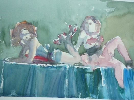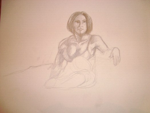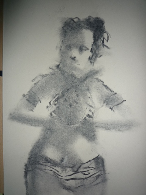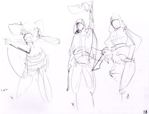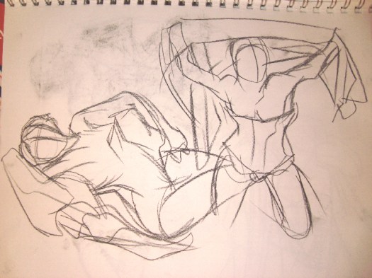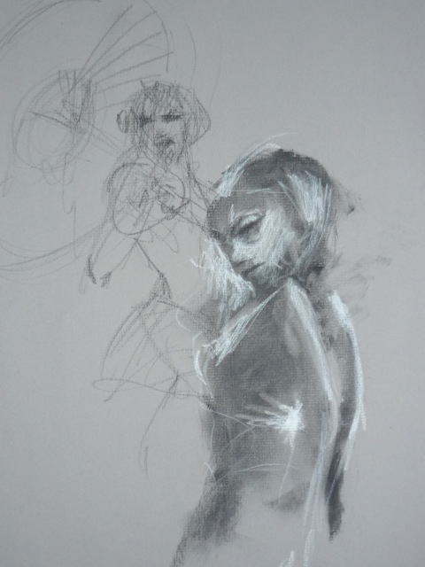 After that, a breather was called for.  When we got back from said breather, it was time for the 5-minute poses, the first of which was the opposite-hand contest.  If you’re right-handed you draw with your left, if you’re left-handed you draw with your right, and if you’re ambidextrous we poke you in the eye with a stick.  The two winners got a mystery-something in a glass from Russell, which to date, has only emptied the winners’ stomachs once, maybe twice.