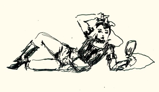 Another break, another drink, and it was 10-minute pose time.  Since the day before had been Quentin Tarantino’s birthday, we asked folks to draw a tribute, with the two winners receiving either an issue of Retro Lovely and an issue of the roller-derby zine Booty by Anne Thalheimer from Atomic Books in Hampden, or a package of Prismacolor color pencils from Artist & Craftsman Supply just down the street.