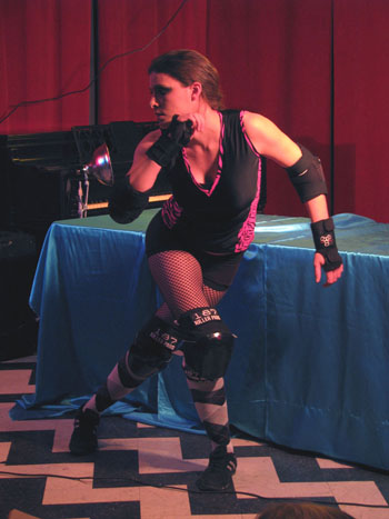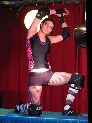 BTW, Adrenaline Junkie was inspecting the massive bruise Smearin’ Off Ice got just days earlier at the Dolls’ last bout. Next up were the 20-minute poses which, well, the Junkyard Dolls just plain ol’ blew out of the water.  Since we thought that last massive group pose looked like a great set-up for a Baroque-style painting, the contest was “best homage to the Old Masters” with the prize being two tickets to see the Junkyard Dolls’ next bout.