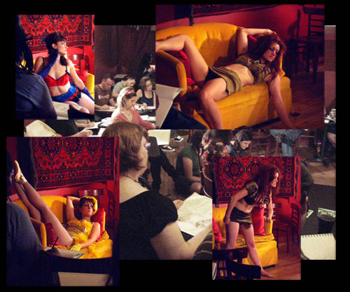 Monday night went great, what we remember of it. Nicolette went above and beyond with an absolutely stunning set of outfits and frighteningly difficult poses; Andrew and Lynn managed to juggle the power-outage-fried cash register system without a single drink getting slowed down, and Alexis and I managed to not fall down ONCE even though we were about eight sheets to the wind by the last set of poses.