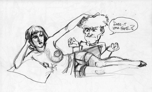 I think the first time Sugar modeled for us was also the first time we played the “random noun” game, in which we ask the audience to shout out the first person, place, or thing that comes to their minds, and then the audience incorporates the best suggestion into their drawings for the chance to win one of our prizes. The best suggestion that evening by far (and, maybe with the exception of last session’s) was Patrick Stewart. Here’s Brian Dugan’s entry: