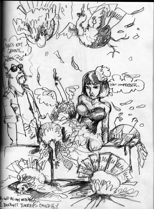 For the next contest, Aaron presented the audience with a quote to interpret and incorporate into their drawings: “As God as my witness, I thought turkeys could fly!”