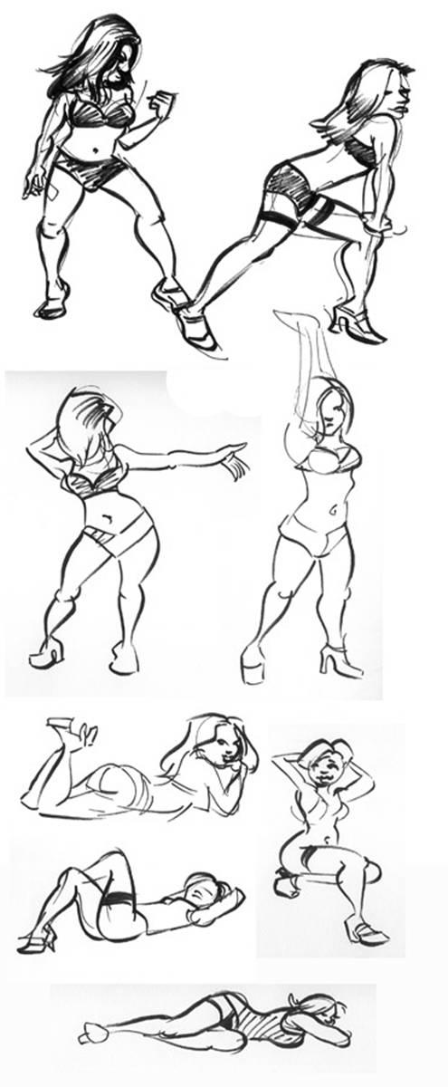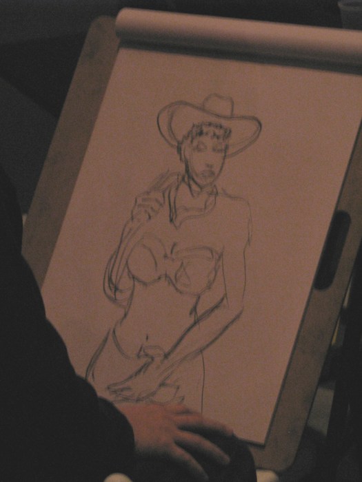 Very special thanks to the simply stunning Sugar Ann Spice for braving the most horrific DC traffic yet again to pose for us that evening, and to all of you lovely and talented folks who came out to draw her! And to Bill the door guy, Jeff the photographer, and Russell the owner/’tender/iPod jockey! But especially, again, to all of you who came out despite the rain and were good sports about the brief model substitute—not only were you guys the biggest group we’ve had so far, but possibly the liveliest. You guys kick ass! Just send us more sketches next time. 😉
