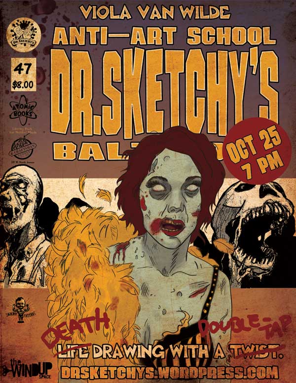 Monday, October 25th, with Viola Van Wilde is the next Dr. Sketchy’s – and this ain’t any old normal Dr. Sketchy crazy, this is our full blow out Halloween Zombie Dr. Sketchy’s Extravaganza Smorgasborg of Crazy Zombie Sketchyness . . .umm, craziness?