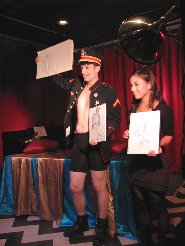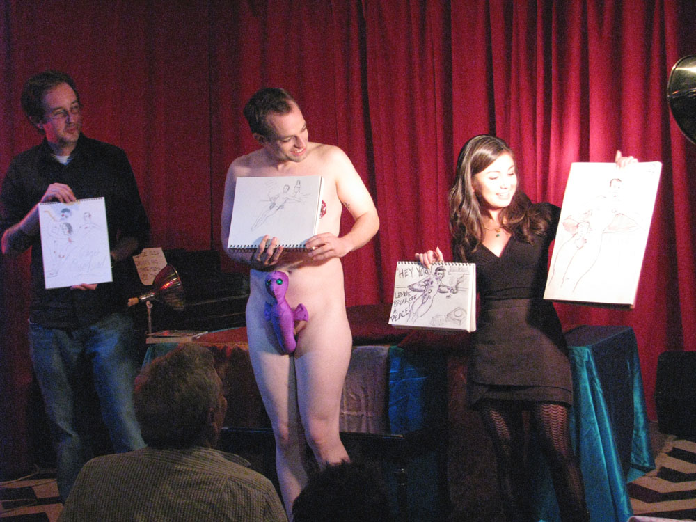 Another break and it was 20-minute pose time, with the first being a random noun contest, which, uh, someone called out the adjective “edible” for. Ā Don’t judge, we were approaching pint-glass armageddon. Ā The two winners received a giant stack of art supplies from Artist & Craftsman Supply right across the street on the corner of North & Howard. Ā There were paints, pads, pencils – a whole mess of stuff.