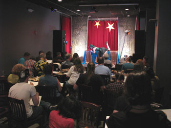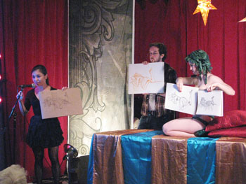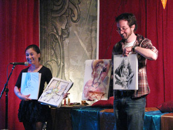 The last contest of the evening was in honor of John Lennon since someone said he had a birthday or something that week. Ā The prize was Popping Through Pictures by Amanda Visell from Baby Tattoo Books, who also runs the L.A. branch of Dr. Sketchy’s.