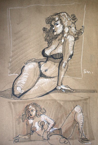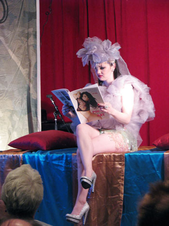 The second 10-minute pose was our second contest of the evening, which was the best incorporation of Marla in Las Vegas. Ā The prizes were an issue of Retro Lovely and Jim Silke’s Pinup: The Illegitimate Art from the bad-assĀ Atomic Books,Ā which is in Hampden on the corner of the Avenue and Falls Road. Ā (You can see Marla perusing Silke’s book while Alexis explained the contest.)