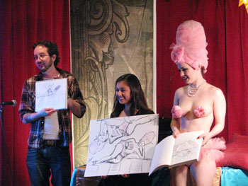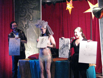 The two prizes, one for each winner, were decorate-yourself masquerade masks from Artist & Craftsman Supply, your friendly neighborhood art supply shop just across the street at the corner of Howard and North. Ā We also announced a dollar off your door cost at the next Dr. Sketchy’s if you show up in costume. Ā More on that later.