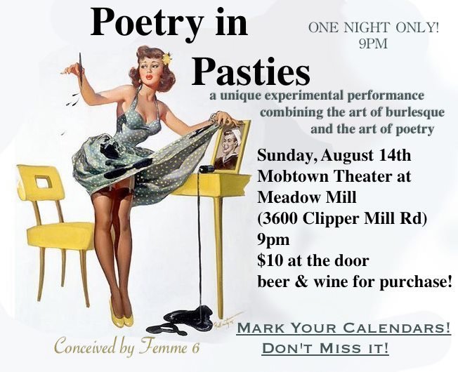 There will be gravity-defying feats of breathtaking beauty, original writings by the performers themselves, retro beat poetry with a twist, classical poems re-imagined in acts of striptease, comedy and drama, a special tribute to Charm City, and many, many more surprises to stimulate you– intellectually! šŸ˜‰ All of this for only $10?? WOWEEEE!